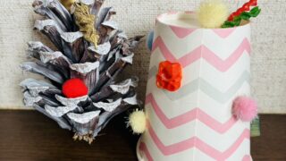 今日は、みんなで大きな松ぼっくりを使ったクリスマスツリーづくりをしました。机の上には、木の実やポンポン、モールやビーズなど、かわいい飾りがたくさん並び…