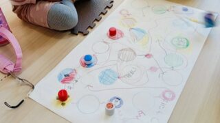 みんなで大きな紙に丸を描いて「すごろくづくり」を行いました。 「ここに描こうかな?」「もっとつなげよう!」と、子どもたち同士でやりとりをしながら、自由…