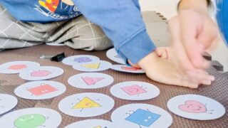 この日は、「表情・色・形カルタ」に挑戦しました。 「赤・丸・にこにこ」など、3つのことばを聞いて覚え、その条件に合うカードを探して取ります。 「どれだ…